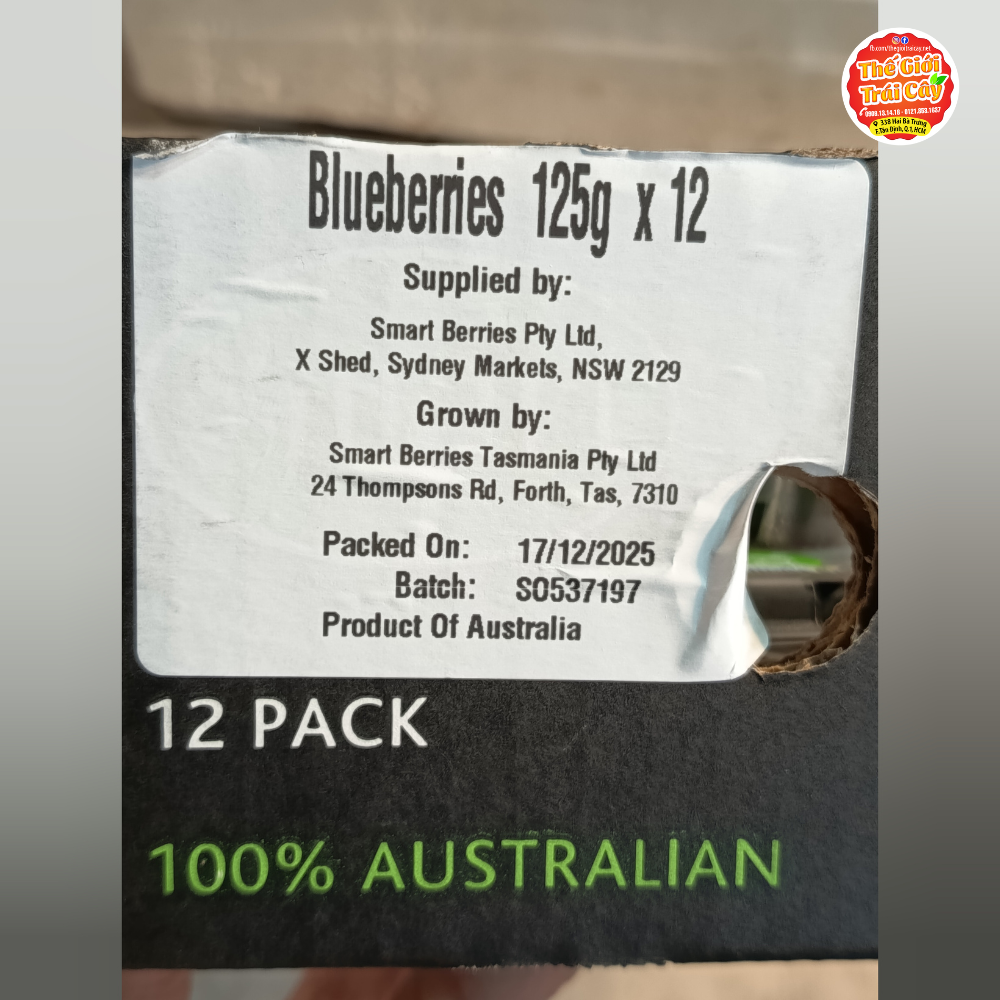 - Việt quất Úc tại Thế giới trái cây có xuất xứ từ vùng Tasmania vùng chuyên canh trái cây ngon nhất của Úc, quả giòn rất ngọt đi kèm mùi thơm nhẹ đặc trưng, hộp 125gr thùng 12 hộp .