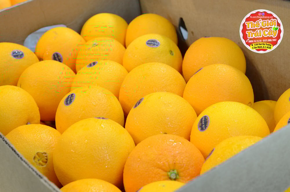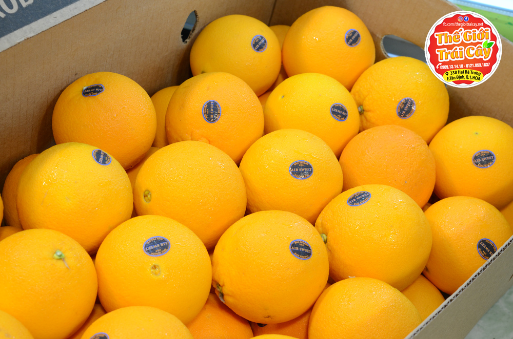 - Cam vàng AirSweet Mỹ tại Thế giới trái cây: mỏng vỏ chắc tay, mọng nước, giống Navel cho vị chua ngọt rất đậm đà khi ăn size 48, 1 quả 400-450gr.