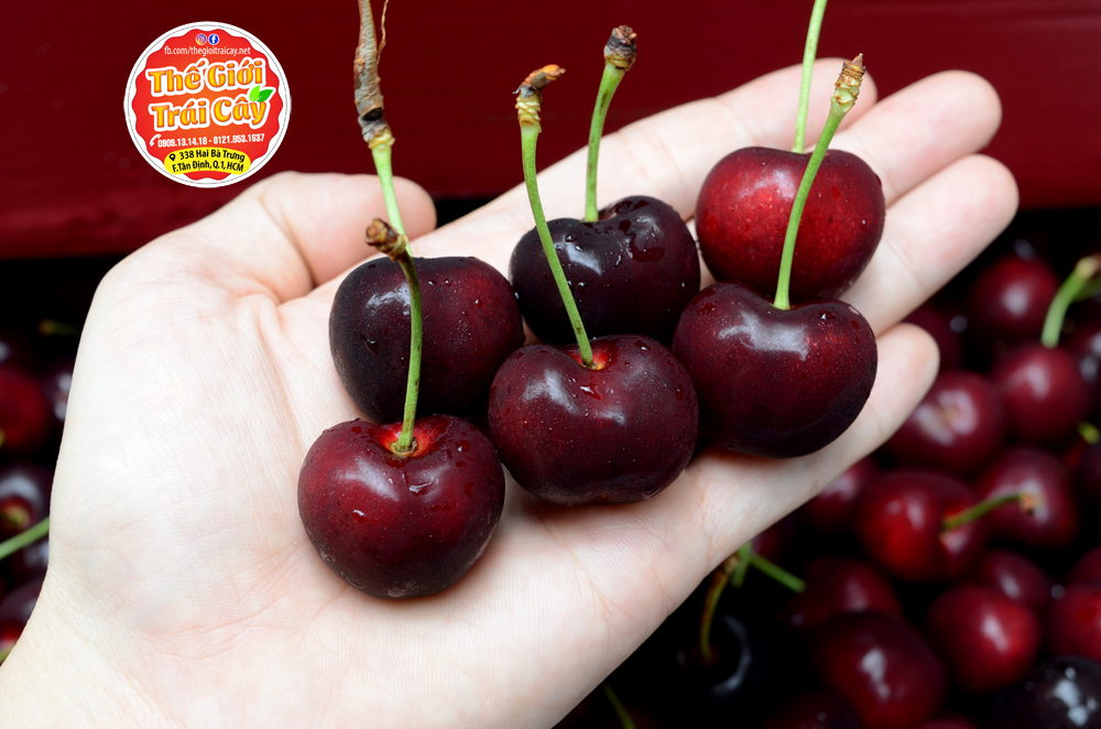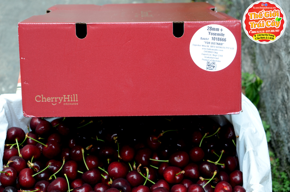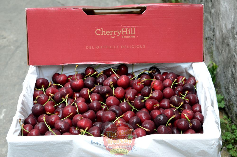 - Cherry Hills Orchard Úc tại Thế giới trái cây: hàng đầu mùa trái cứng vị chua ngọt 95%, cuống xanh um da căng mịn, size 28 tương đương size 9 của Mỹ .