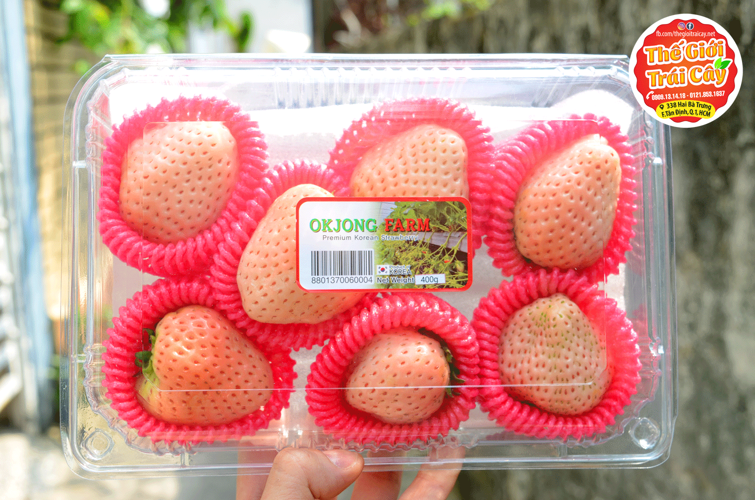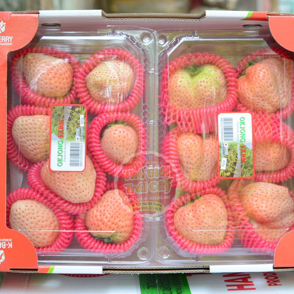 - Dâu Bạch tuyết OkJong Farm 400gr tại Thế giới trái cây: quả dâu có 2 màu trắng và hồng lạ mắt mang hơi hướng sang trọng rất thích hợp cho việc làm quà tặng, hàng chính nghạch, trái to, ăn ngọt không chua kèm mùi thơm nồng nàn .