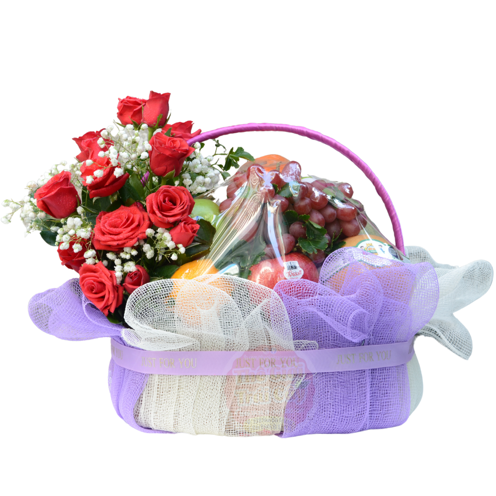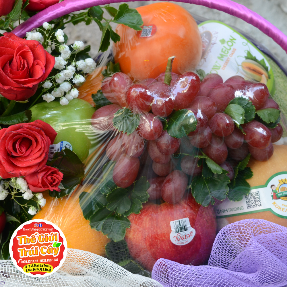 - Thành phần: Dưa lưới Đài Loan | Cam vàng Úc | Táo Envy Newzealand | Lê hàn quốc | Hồng giòn Fuju | Nho đỏ không hạt nội địa Trung | Bông hồng