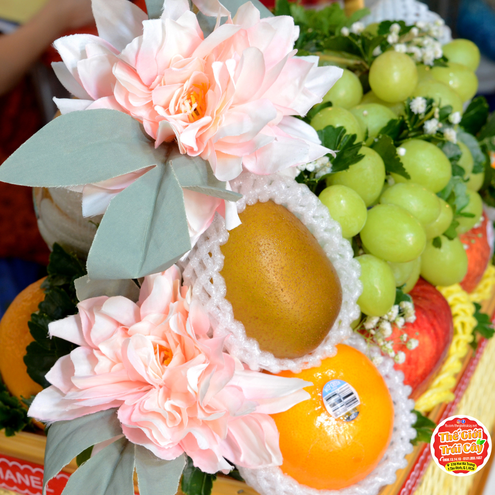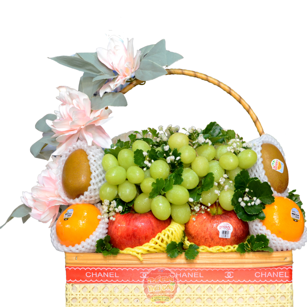 - Thành phần: Kiwi vàng Newzealand Zespri | Lê Hàn quốc | Táo Envy | Nho xanh Mỹ | Cam vàng Mỹ | Bông khách có thể chọn theo yêu cầu .