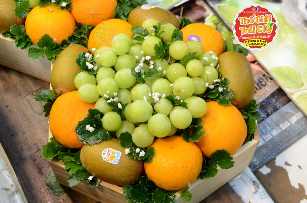 - Thành phần: Quýt Úc 5 quả | Kiwi vàng Zespri NewZealand 6 quả | Nho xanh không hạt AutumnCrips Mỹ 1kg | Lá đinh lăng+ Bông bi trắng làm điểm nhấn .
