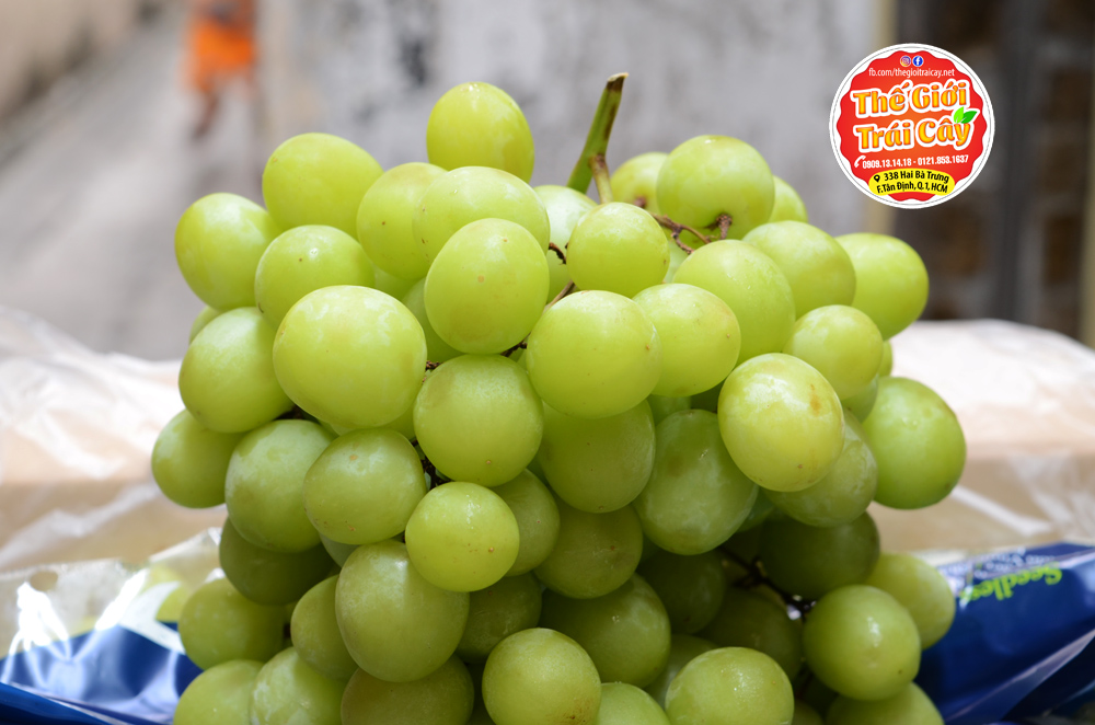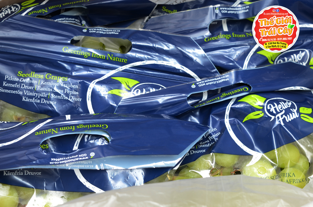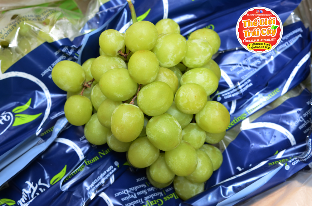 - Nho xanh Hellos Nam phi tại Thế giới trái cây có đặc điểm:giống Autumn Crips trái tròn rất to, cực giòn vị ngọt 95% có xen một ít chua nhẹ không đáng kể, hàng theo chùm chuỗi thích hợp cho khách chưng cúng hoặc làm quà.