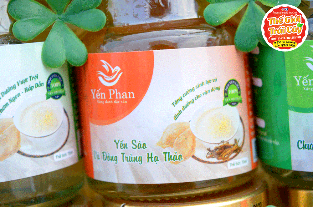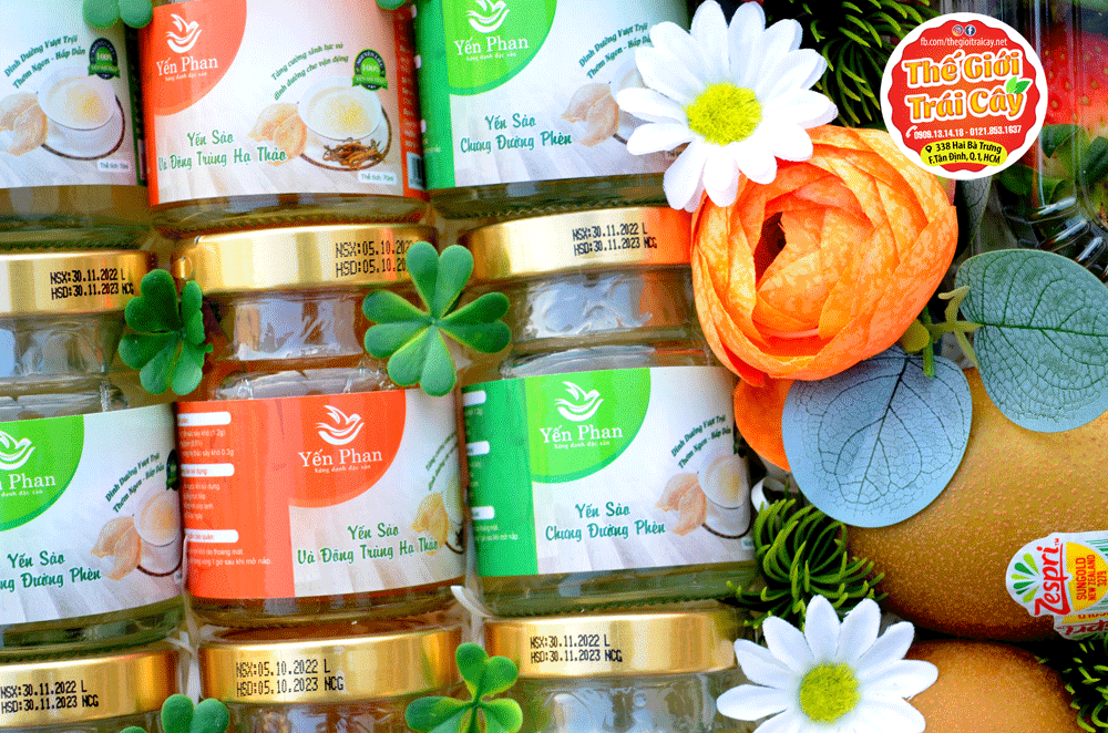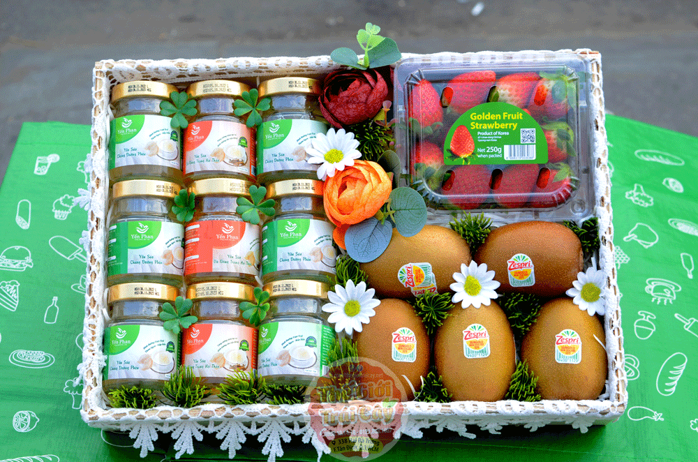 - Thành phần: 1 lốc 6 hủ Yến chưng đường phèn, 3 hủ Yến sào và đông trùng hạ thảo , Dâu Hàn quốc 250gr 1 hộp, Kiwi vàng 5 quả, bông trang trí kèm theo.